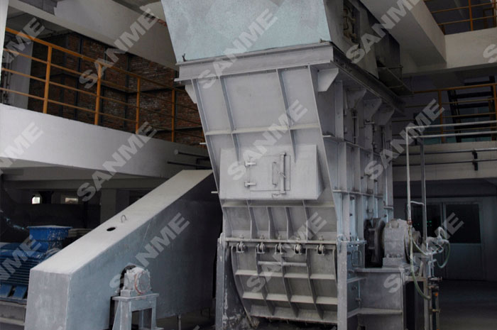 (1)破碎:石膏原料經(jīng)由給料機進入破碎機,破碎機將大尺寸的石膏礦石破碎成小于30mm的小塊顆粒,備用。根據(jù)石膏原料的大小和不同產(chǎn)量需求,可以選擇對應規(guī)格的破碎機,通常DSJ系列烘干錘式破碎機可將含水量≤12%的脫硫石膏渣料餅通過烘干錘式破碎機的轉子將其打散、拋揚,并與引入的550℃熱風充分熱交換,形成含水量≤1%的物料,物料由出風管進入上升管道被熱風帶走進入下道工序。